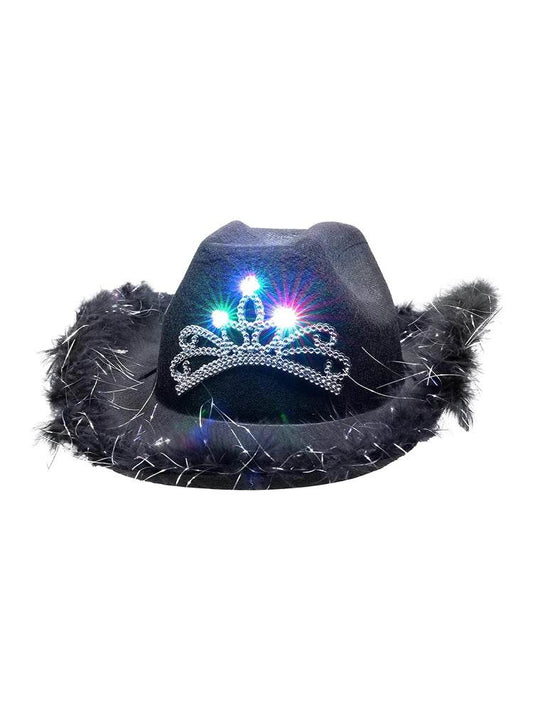 Adult Light Up Tiara Black Cowboy Hat with Fluffy Trim